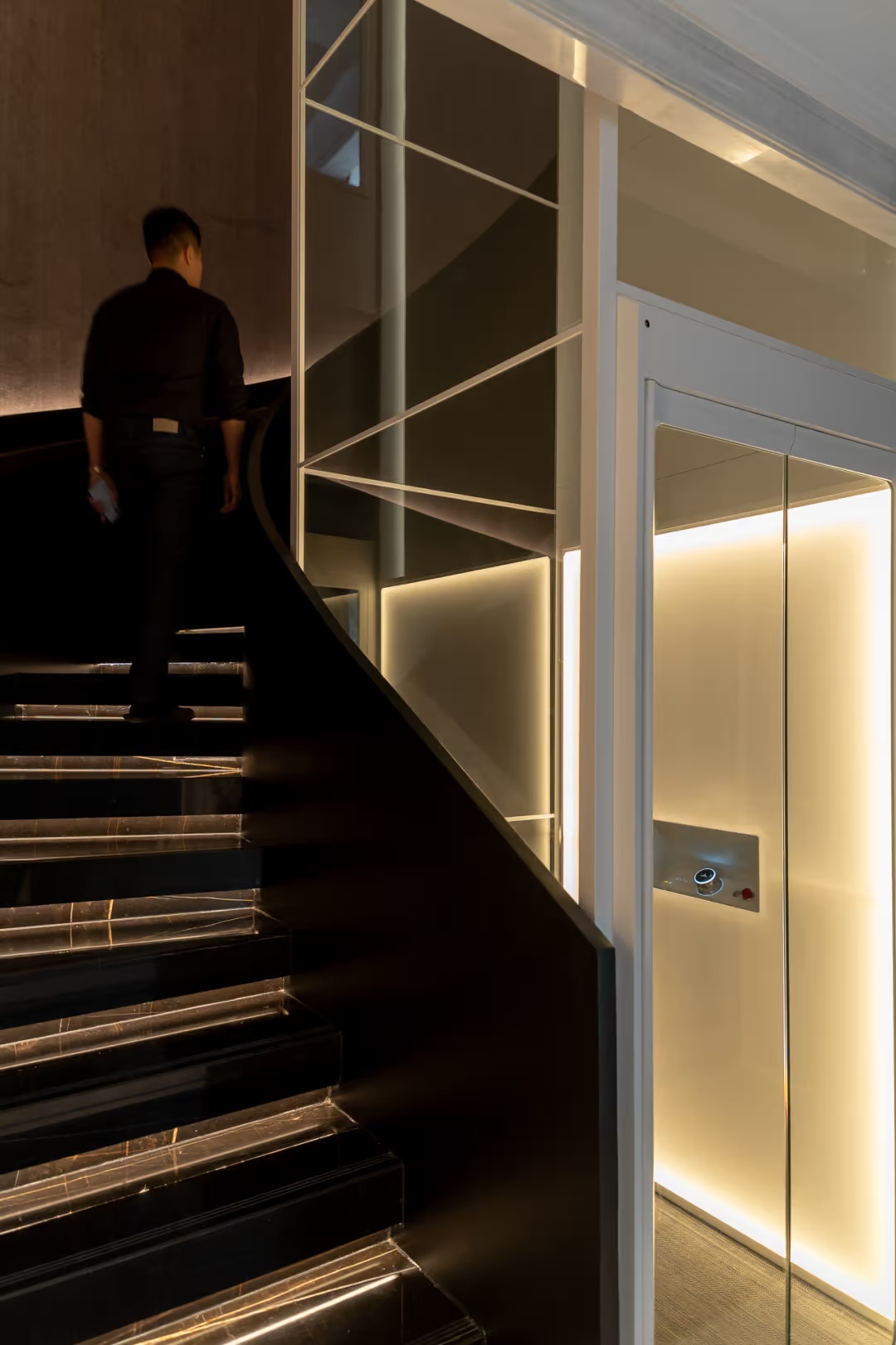 位於倫敦 Knightsbridge 的豪華聯排屋,需要一部能連結四層、又不影響採光的電梯。建築師受過往專案中的 Aritco HomeLift 啟發,採三面客製玻璃的配置;二樓的充足光線順著電梯井道向下灑落,一路延伸到地下室,再搭配柔和的 DesignLight,形塑通透明亮的垂直光廊。Aritco HomeLift 與華麗吊燈、重點照明、bouclé 圈圈紗羅馬簾及金屬質感飾面相互呼應,完整呈現這座豪邸的氣韻。
