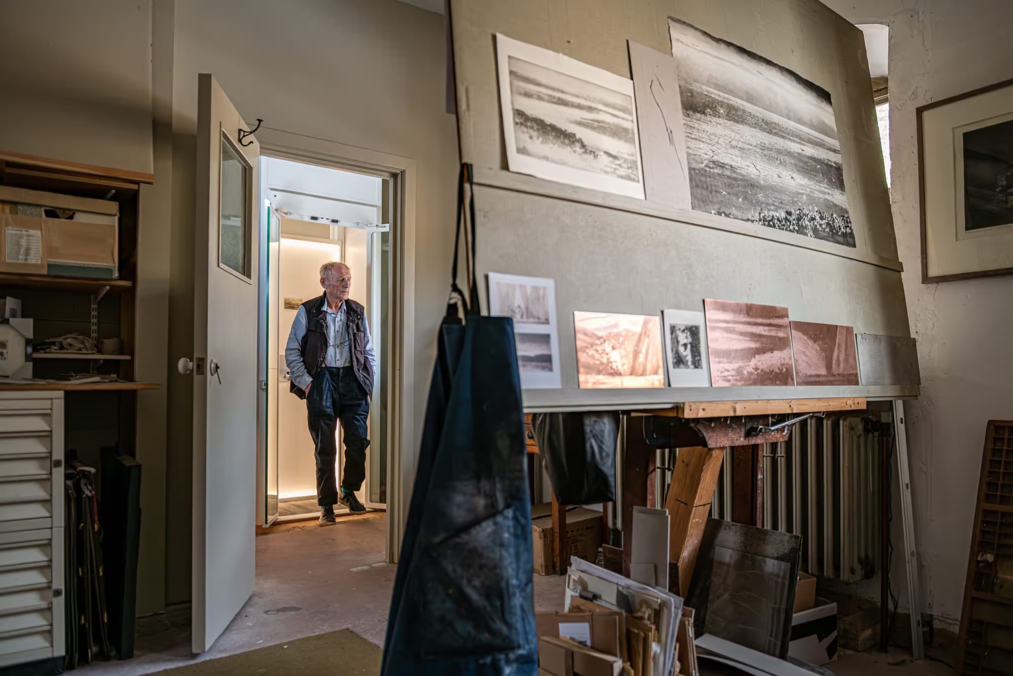 時間回到 1983 年。當時他住在南倫敦 Clapham 的一般住宅,但創作傳統手工蝕刻、操作古董印刷機,需要更寬敞的工作空間。最後,他在靠近 London Bridge 的 Bermondsey 找到理想場地——一棟幾近荒廢、橫跨四層的舊倉庫。屋況很原始:天花板有破洞,一樓只有一個電源插座和一支水龍頭;但結構扎實、條件單純,對他來說就是一張空白畫布。